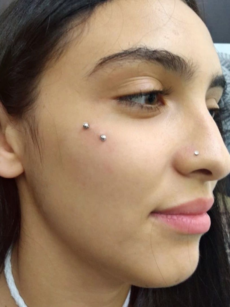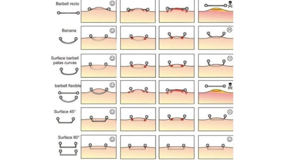Above is all about dermal piercing lets now talk about surface piercing it is usually done on the flat areas of the body like the upper cheeks or chest area. Like other piercings, there is an entrance perforation and exit perforation that is located behind the entrance but in case of surface piercing both the perforations lie next to each other on the skin.